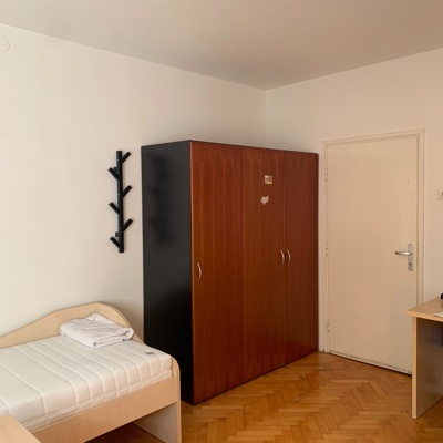Nastanitev se nahaja na mirni lokaciji Bežigrad. Bližina šestih fakultet: Pedagoške, Ekonomske, Upravne, Fakultete za družbene vede, Fakultete za Dizajn in Fakultete za podjetništvo – GEA College. Do centra mesta smo oddaljeni 15 minut z busom ali kolesom. Oddajamo eno posteljo v dvoposteljni sobi. Cena najema skupaj s stroški na osebo 390 eur/mesečno. Soba je vseljiva od februarja 2026. Pogodbo sklepamo za obdobje enega semestra ali več in ne manj kot 6 mesecev.